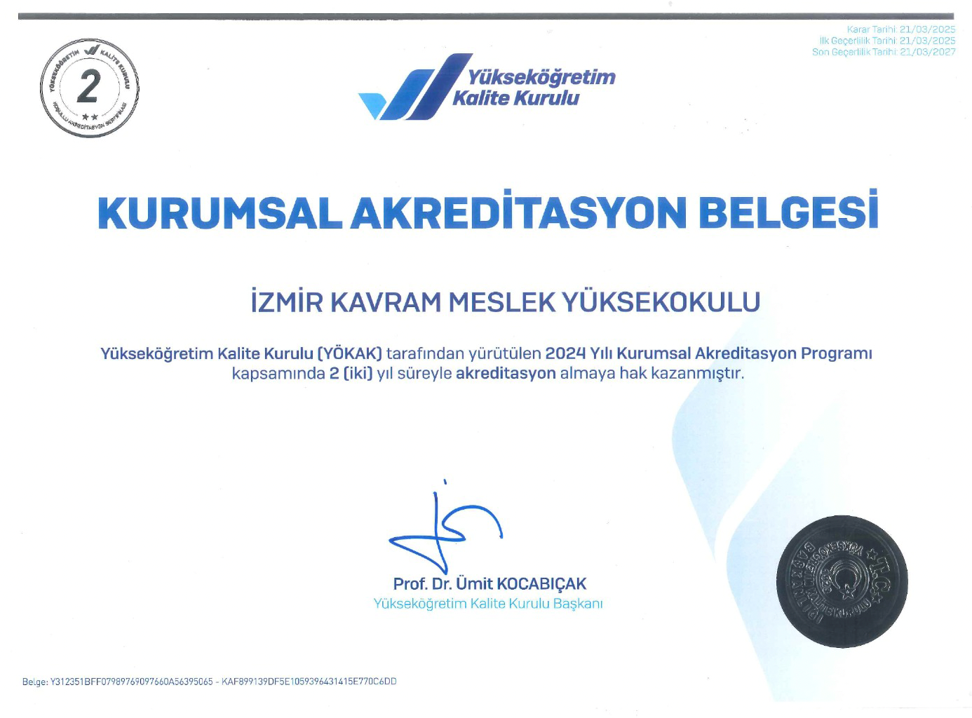 YÖKAK Kurumsal Akreditasyon Belgesi